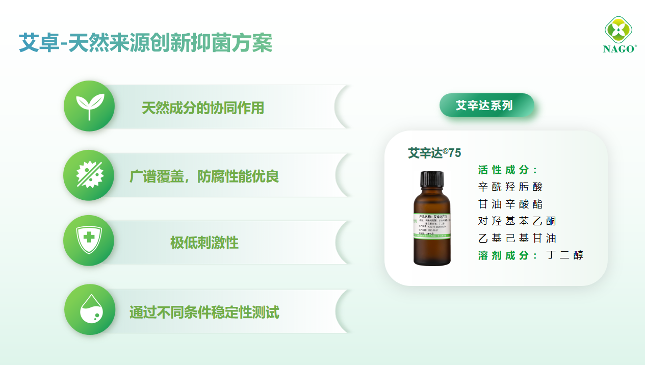 艾辛达®75——以天然抑菌成分辛酰羟肟酸为核心,复配甘油辛酸酯、对羟基苯乙酮及乙基己基甘油形成螯合-抗氧-抑菌三重屏障,天然成分占比75%超越欧盟ECOCERT天然认证基线。适用于面膜、膏霜等多元体系,通过皮肤刺激性测试验证,实现安全与功效的精准平衡。